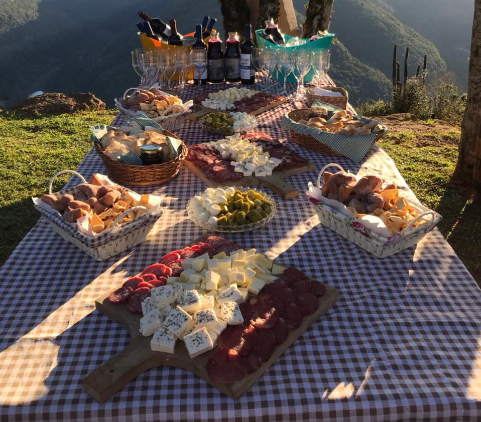 Aprecie a bela vista com pôr do sol no Mirante De Bastiani acompanhado de nossas delicias. Inclui cesta com salame, queijo copa, ovos de codorna, pepino, geleia, pão colonial, grostoli e grostoli fino.