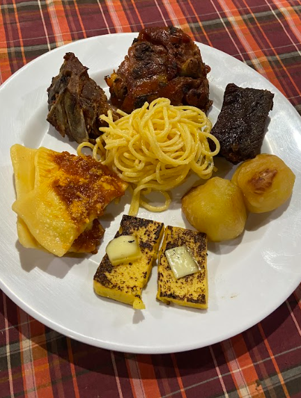 Polenta brustolada com salame e queijo, sopa de capeletti, tortéi, galeto no forno com batata inglesa, dois tipos de salada, sagu, pudim, vinho e suco de uva.
