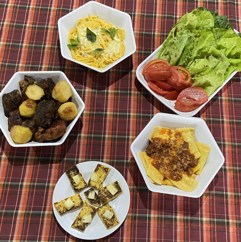 Polenta brustolada com salame e queijo, galeto com batata inglesa, tortéi, massa carbonara, salada verde, salada de tomate, sagu e pudim.
